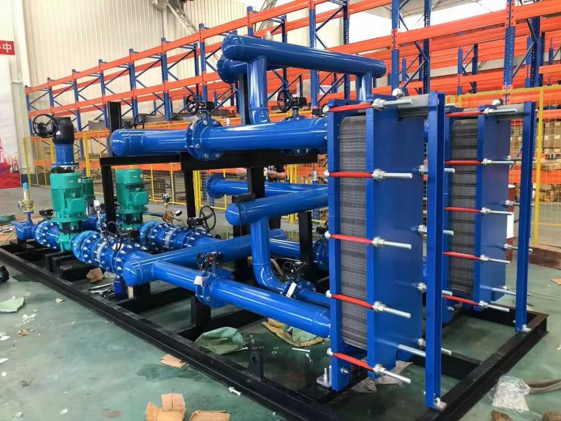 換熱機(jī)組是一套組裝在機(jī)架上的熱交換組合裝置,包括板式換熱器、循環(huán)泵、補(bǔ)水泵、變頻器、測量調(diào)節(jié)與自動控制元件和必備的管閥附件、壓力表、溫度計等。機(jī)組占地面積小、連接緊湊、便于安裝、操作和維修,同時考慮了運(yùn)輸、就位的方便。